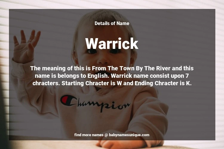 The name Warrick is chosen by those who are willing to find Unique Boy Baby Names. The meaning of this is From The Town By The River and this name is belongs to English Origin. Baby Name Warrick consist upon 7 chracters. Starting alphabet is W and ending alphabet is K. This name is used primarily by parents who are considering unique baby names for Boy. The Zodiac Sign suitbale for this name are;