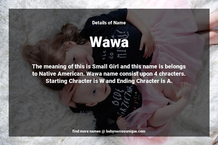 The name Wawa is chosen by those who are willing to find Unique Transgenders Baby Names. The meaning of this is Small Girl and this name is belongs to Native American Origin. Baby Name Wawa consist upon 4 chracters. Starting alphabet is W and ending alphabet is A. This name is used primarily by parents who are considering unique baby names for Transgenders. The Zodiac Sign suitbale for this name are;