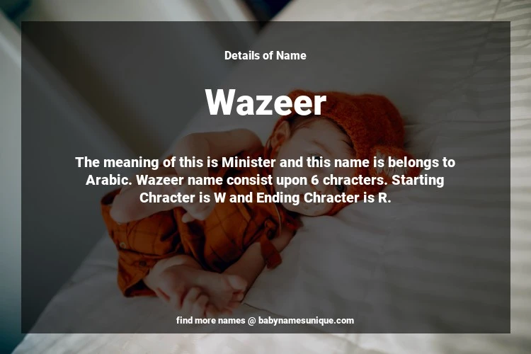 The name Wazeer is chosen by those who are willing to find Unique Boy Baby Names. The meaning of this is Minister and this name is belongs to Arabic Origin. Baby Name Wazeer consist upon 6 chracters. Starting alphabet is W and ending alphabet is R. This name is used primarily by parents who are considering unique baby names for Boy. The Zodiac Sign suitbale for this name are;