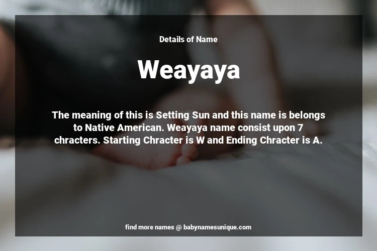 The name Weayaya is chosen by those who are willing to find Unique Boy Baby Names. The meaning of this is Setting Sun and this name is belongs to Native American Origin. Baby Name Weayaya consist upon 7 chracters. Starting alphabet is W and ending alphabet is A. This name is used primarily by parents who are considering unique baby names for Boy. The Zodiac Sign suitbale for this name are;