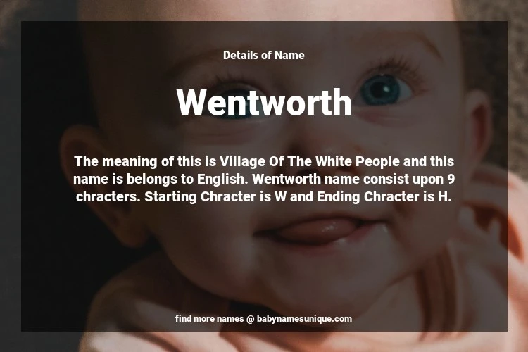 The name Wentworth is chosen by those who are willing to find Unique Boy Baby Names. The meaning of this is Village Of The White People and this name is belongs to English Origin. Baby Name Wentworth consist upon 9 chracters. Starting alphabet is W and ending alphabet is H. This name is used primarily by parents who are considering unique baby names for Boy. The Zodiac Sign suitbale for this name are;