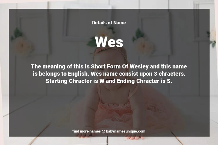 The name Wes is chosen by those who are willing to find Unique Boy Baby Names. The meaning of this is Short Form Of Wesley and this name is belongs to English Origin. Baby Name Wes consist upon 3 chracters. Starting alphabet is W and ending alphabet is S. This name is used primarily by parents who are considering unique baby names for Boy. The Zodiac Sign suitbale for this name are;