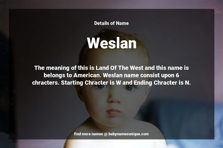 The name Weslan is chosen by those who are willing to find Unique Transgenders Baby Names. The meaning of this is Land Of The West and this name is belongs to American Origin. Baby Name Weslan consist upon 6 chracters. Starting alphabet is W and ending alphabet is N. This name is used primarily by parents who are considering unique baby names for Transgenders. The Zodiac Sign suitbale for this name are;