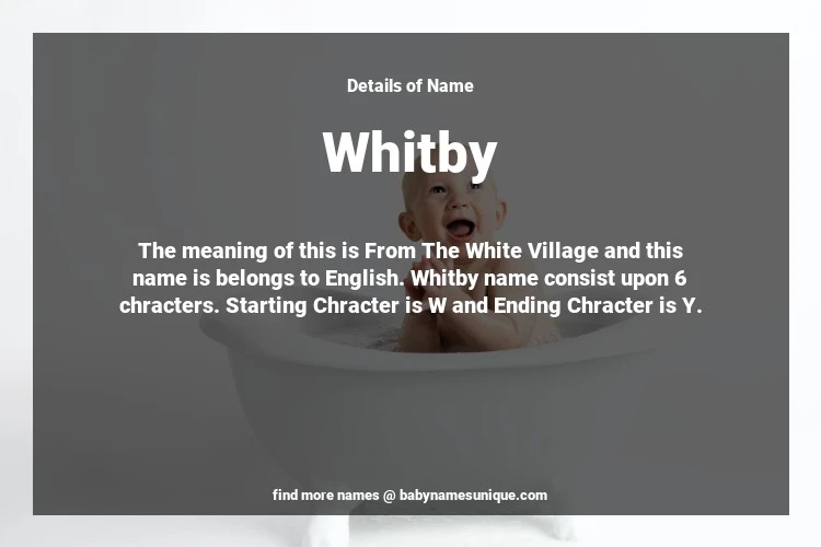 The name Whitby is chosen by those who are willing to find Unique Boy Baby Names. The meaning of this is From The White Village and this name is belongs to English Origin. Baby Name Whitby consist upon 6 chracters. Starting alphabet is W and ending alphabet is Y. This name is used primarily by parents who are considering unique baby names for Boy. The Zodiac Sign suitbale for this name are;