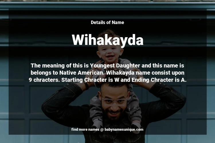 The name Wihakayda is chosen by those who are willing to find Unique Transgenders Baby Names. The meaning of this is Youngest Daughter and this name is belongs to Native American Origin. Baby Name Wihakayda consist upon 9 chracters. Starting alphabet is W and ending alphabet is A. This name is used primarily by parents who are considering unique baby names for Transgenders. The Zodiac Sign suitbale for this name are;