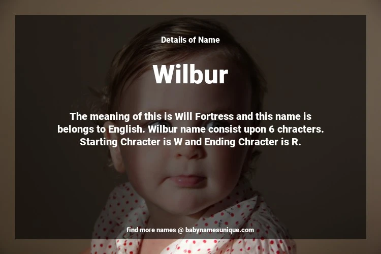 The name Wilbur is chosen by those who are willing to find Unique Boy Baby Names. The meaning of this is Will Fortress and this name is belongs to English Origin. Baby Name Wilbur consist upon 6 chracters. Starting alphabet is W and ending alphabet is R. This name is used primarily by parents who are considering unique baby names for Boy. The Zodiac Sign suitbale for this name are;