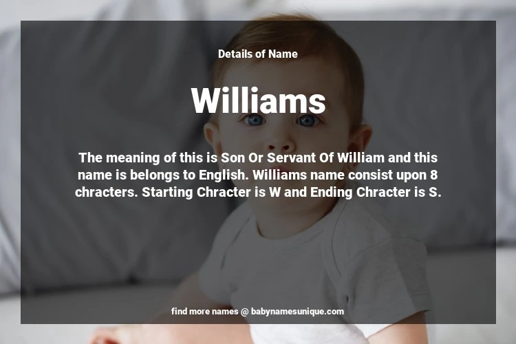 The name Williams is chosen by those who are willing to find Unique Boy Baby Names. The meaning of this is Son Or Servant Of William and this name is belongs to English Origin. Baby Name Williams consist upon 8 chracters. Starting alphabet is W and ending alphabet is S. This name is used primarily by parents who are considering unique baby names for Boy. The Zodiac Sign suitbale for this name are;