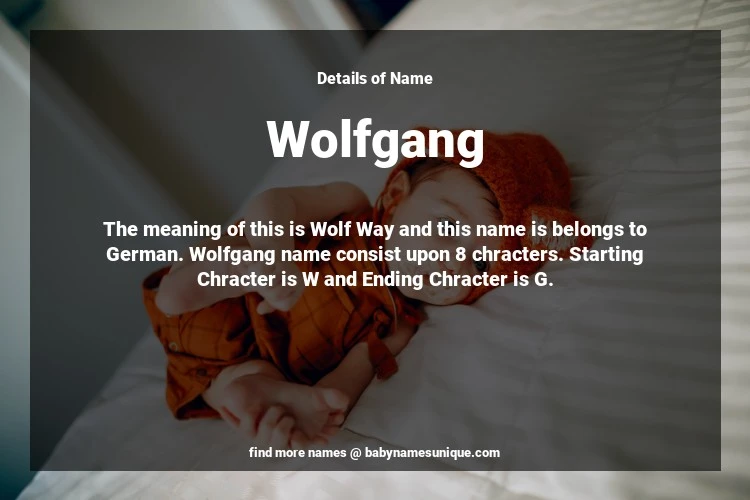 The name Wolfgang is chosen by those who are willing to find Unique Boy Baby Names. The meaning of this is Wolf Way and this name is belongs to German Origin. Baby Name Wolfgang consist upon 8 chracters. Starting alphabet is W and ending alphabet is G. This name is used primarily by parents who are considering unique baby names for Boy. The Zodiac Sign suitbale for this name are;