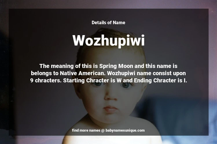 The name Wozhupiwi is chosen by those who are willing to find Unique Transgenders Baby Names. The meaning of this is Spring Moon and this name is belongs to Native American Origin. Baby Name Wozhupiwi consist upon 9 chracters. Starting alphabet is W and ending alphabet is I. This name is used primarily by parents who are considering unique baby names for Transgenders. The Zodiac Sign suitbale for this name are;