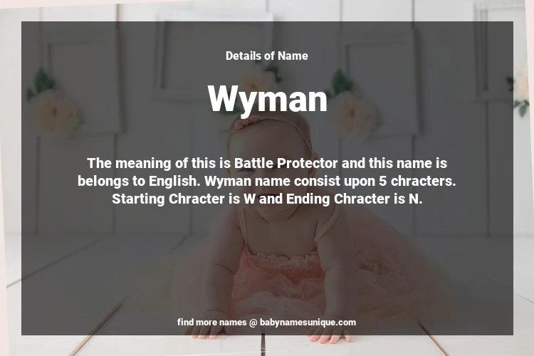 The name Wyman is chosen by those who are willing to find Unique Boy Baby Names. The meaning of this is Battle Protector and this name is belongs to English Origin. Baby Name Wyman consist upon 5 chracters. Starting alphabet is W and ending alphabet is N. This name is used primarily by parents who are considering unique baby names for Boy. The Zodiac Sign suitbale for this name are;