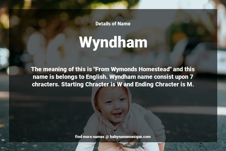 The name Wyndham is chosen by those who are willing to find Unique Boy Baby Names. The meaning of this is "From Wymonds Homestead" and this name is belongs to English Origin. Baby Name Wyndham consist upon 7 chracters. Starting alphabet is W and ending alphabet is M. This name is used primarily by parents who are considering unique baby names for Boy. The Zodiac Sign suitbale for this name are;
