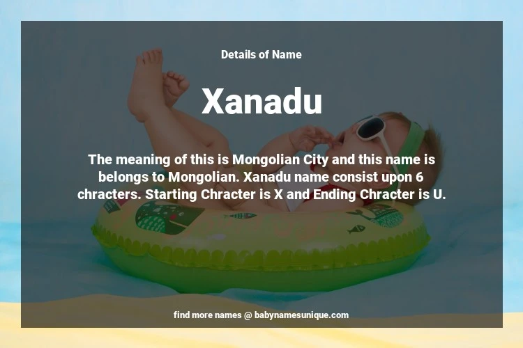 The name Xanadu is chosen by those who are willing to find Unique Transgenders Baby Names. The meaning of this is Mongolian City and this name is belongs to Mongolian Origin. Baby Name Xanadu consist upon 6 chracters. Starting alphabet is X and ending alphabet is U. This name is used primarily by parents who are considering unique baby names for Transgenders. The Zodiac Sign suitbale for this name are;