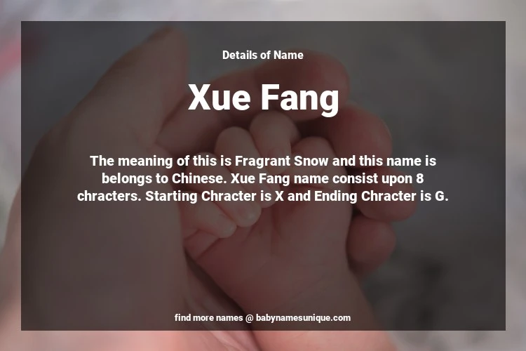 The name Xue Fang is chosen by those who are willing to find Unique Transgenders Baby Names. The meaning of this is Fragrant Snow and this name is belongs to Chinese Origin. Baby Name Xue Fang consist upon 8 chracters. Starting alphabet is X and ending alphabet is G. This name is used primarily by parents who are considering unique baby names for Transgenders. The Zodiac Sign suitbale for this name are;