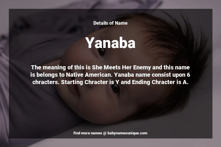 The name Yanaba is chosen by those who are willing to find Unique Transgenders Baby Names. The meaning of this is She Meets Her Enemy and this name is belongs to Native American Origin. Baby Name Yanaba consist upon 6 chracters. Starting alphabet is Y and ending alphabet is A. This name is used primarily by parents who are considering unique baby names for Transgenders. The Zodiac Sign suitbale for this name are;