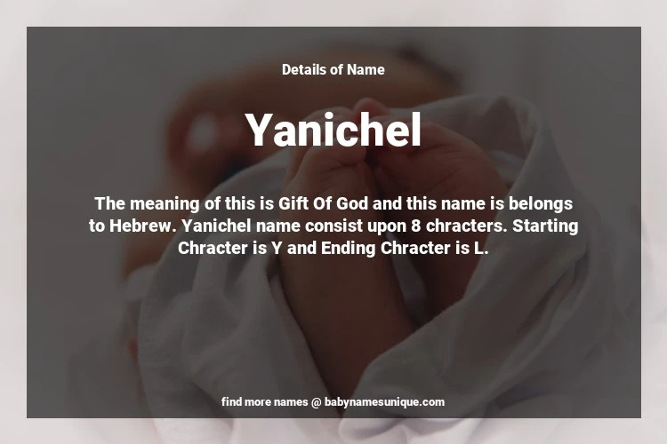 The name Yanichel is chosen by those who are willing to find Unique Transgenders Baby Names. The meaning of this is Gift Of God and this name is belongs to Hebrew Origin. Baby Name Yanichel consist upon 8 chracters. Starting alphabet is Y and ending alphabet is L. This name is used primarily by parents who are considering unique baby names for Transgenders. The Zodiac Sign suitbale for this name are;