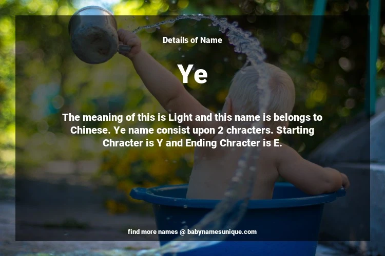 The name Ye is chosen by those who are willing to find Unique Boy Baby Names. The meaning of this is Light and this name is belongs to Chinese Origin. Baby Name Ye consist upon 2 chracters. Starting alphabet is Y and ending alphabet is E. This name is used primarily by parents who are considering unique baby names for Boy. The Zodiac Sign suitbale for this name are;