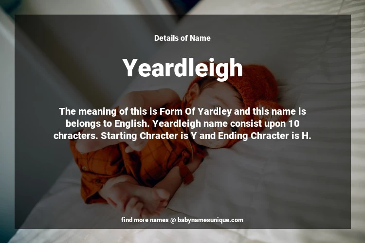 The name Yeardleigh is chosen by those who are willing to find Unique Transgenders Baby Names. The meaning of this is Form Of Yardley and this name is belongs to English Origin. Baby Name Yeardleigh consist upon 10 chracters. Starting alphabet is Y and ending alphabet is H. This name is used primarily by parents who are considering unique baby names for Transgenders. The Zodiac Sign suitbale for this name are;