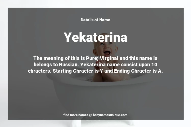 The name Yekaterina is chosen by those who are willing to find Unique Transgenders Baby Names. The meaning of this is Pure; Virginal and this name is belongs to Russian Origin. Baby Name Yekaterina consist upon 10 chracters. Starting alphabet is Y and ending alphabet is A. This name is used primarily by parents who are considering unique baby names for Transgenders. The Zodiac Sign suitbale for this name are;