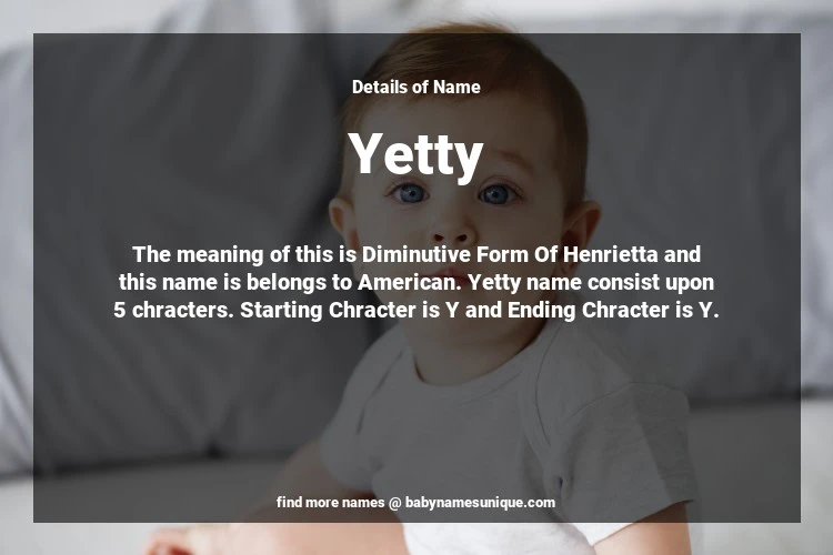 The name Yetty is chosen by those who are willing to find Unique Transgenders Baby Names. The meaning of this is Diminutive Form Of Henrietta and this name is belongs to American Origin. Baby Name Yetty consist upon 5 chracters. Starting alphabet is Y and ending alphabet is Y. This name is used primarily by parents who are considering unique baby names for Transgenders. The Zodiac Sign suitbale for this name are;