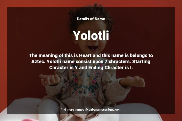 The name Yolotli is chosen by those who are willing to find Unique Transgenders Baby Names. The meaning of this is Heart and this name is belongs to Aztec Origin. Baby Name Yolotli consist upon 7 chracters. Starting alphabet is Y and ending alphabet is I. This name is used primarily by parents who are considering unique baby names for Transgenders. The Zodiac Sign suitbale for this name are;