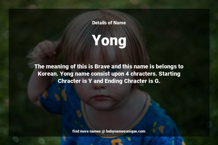 The name Yong is chosen by those who are willing to find Unique Boy Baby Names. The meaning of this is Brave and this name is belongs to Korean Origin. Baby Name Yong consist upon 4 chracters. Starting alphabet is Y and ending alphabet is G. This name is used primarily by parents who are considering unique baby names for Boy. The Zodiac Sign suitbale for this name are;