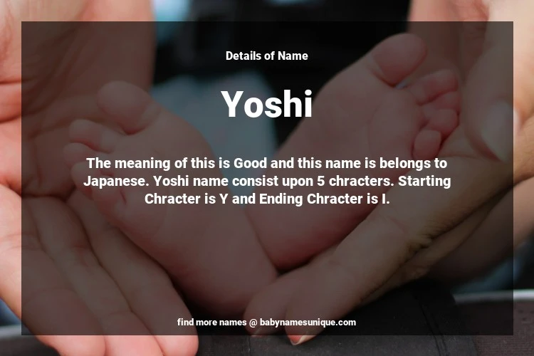 The name Yoshi is chosen by those who are willing to find Unique Transgenders Baby Names. The meaning of this is Good and this name is belongs to Japanese Origin. Baby Name Yoshi consist upon 5 chracters. Starting alphabet is Y and ending alphabet is I. This name is used primarily by parents who are considering unique baby names for Transgenders. The Zodiac Sign suitbale for this name are;