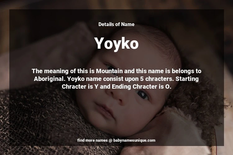 The name Yoyko is chosen by those who are willing to find Unique Transgenders Baby Names. The meaning of this is Mountain and this name is belongs to Aboriginal Origin. Baby Name Yoyko consist upon 5 chracters. Starting alphabet is Y and ending alphabet is O. This name is used primarily by parents who are considering unique baby names for Transgenders. The Zodiac Sign suitbale for this name are;