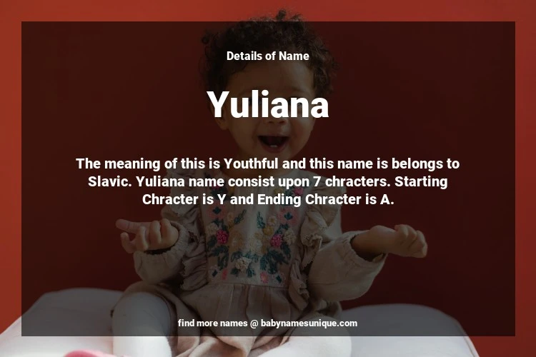 The name Yuliana is chosen by those who are willing to find Unique Transgenders Baby Names. The meaning of this is Youthful and this name is belongs to Slavic Origin. Baby Name Yuliana consist upon 7 chracters. Starting alphabet is Y and ending alphabet is A. This name is used primarily by parents who are considering unique baby names for Transgenders. The Zodiac Sign suitbale for this name are;