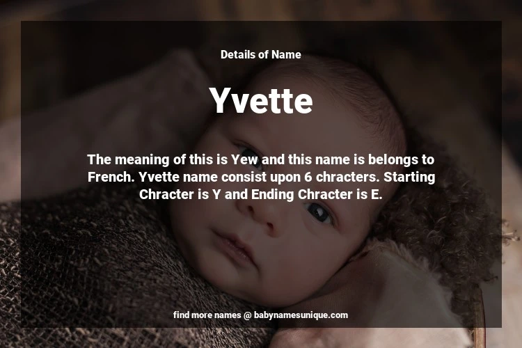 The name Yvette is chosen by those who are willing to find Unique Transgenders Baby Names. The meaning of this is Yew and this name is belongs to French Origin. Baby Name Yvette consist upon 6 chracters. Starting alphabet is Y and ending alphabet is E. This name is used primarily by parents who are considering unique baby names for Transgenders. The Zodiac Sign suitbale for this name are;